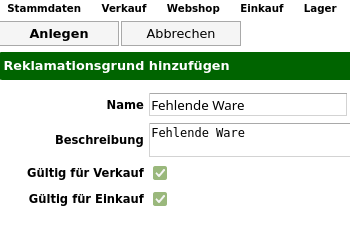 Unter dem Menu "System->Reklamationsgründe" muss mindestens ein Reklamationsgrund erfasst werden.